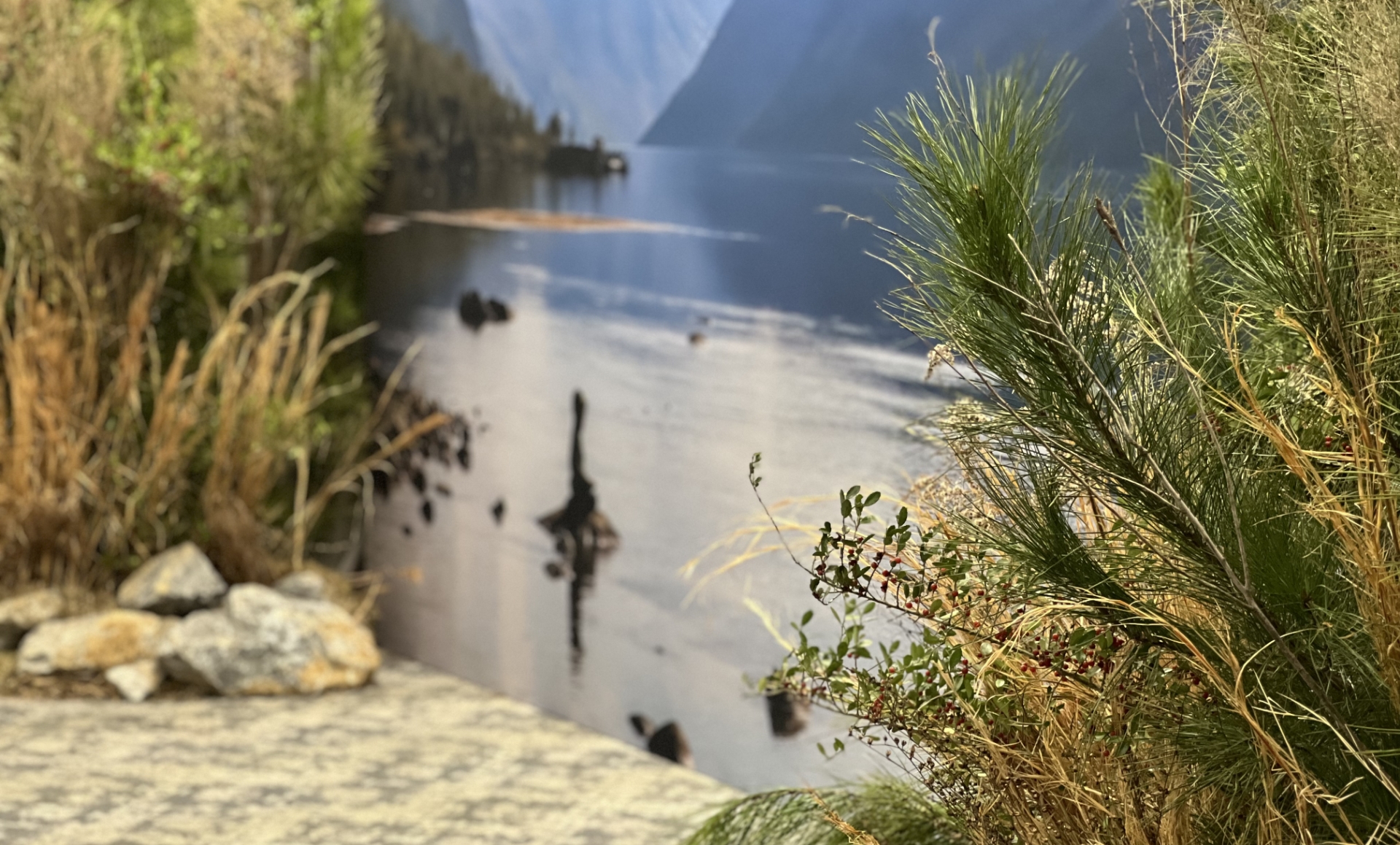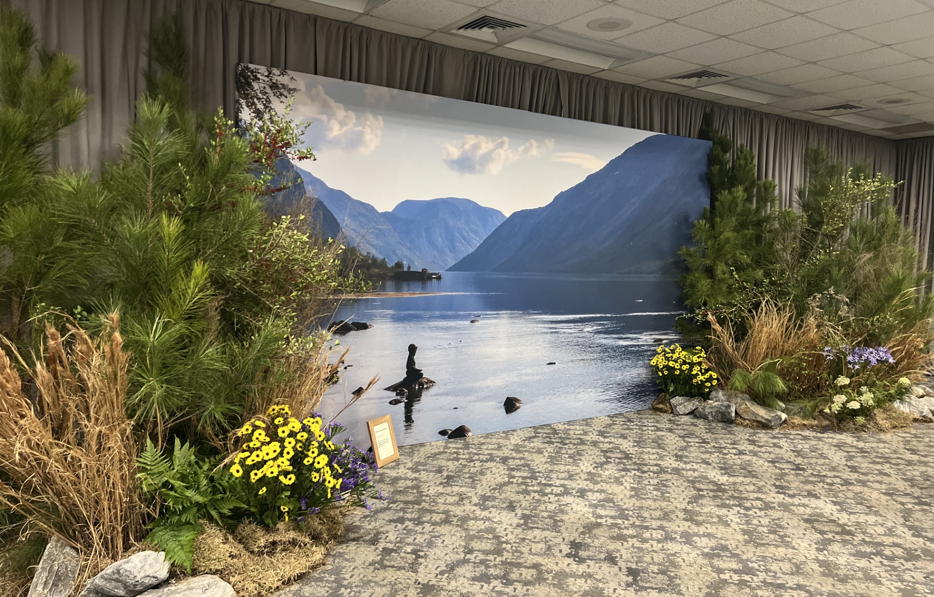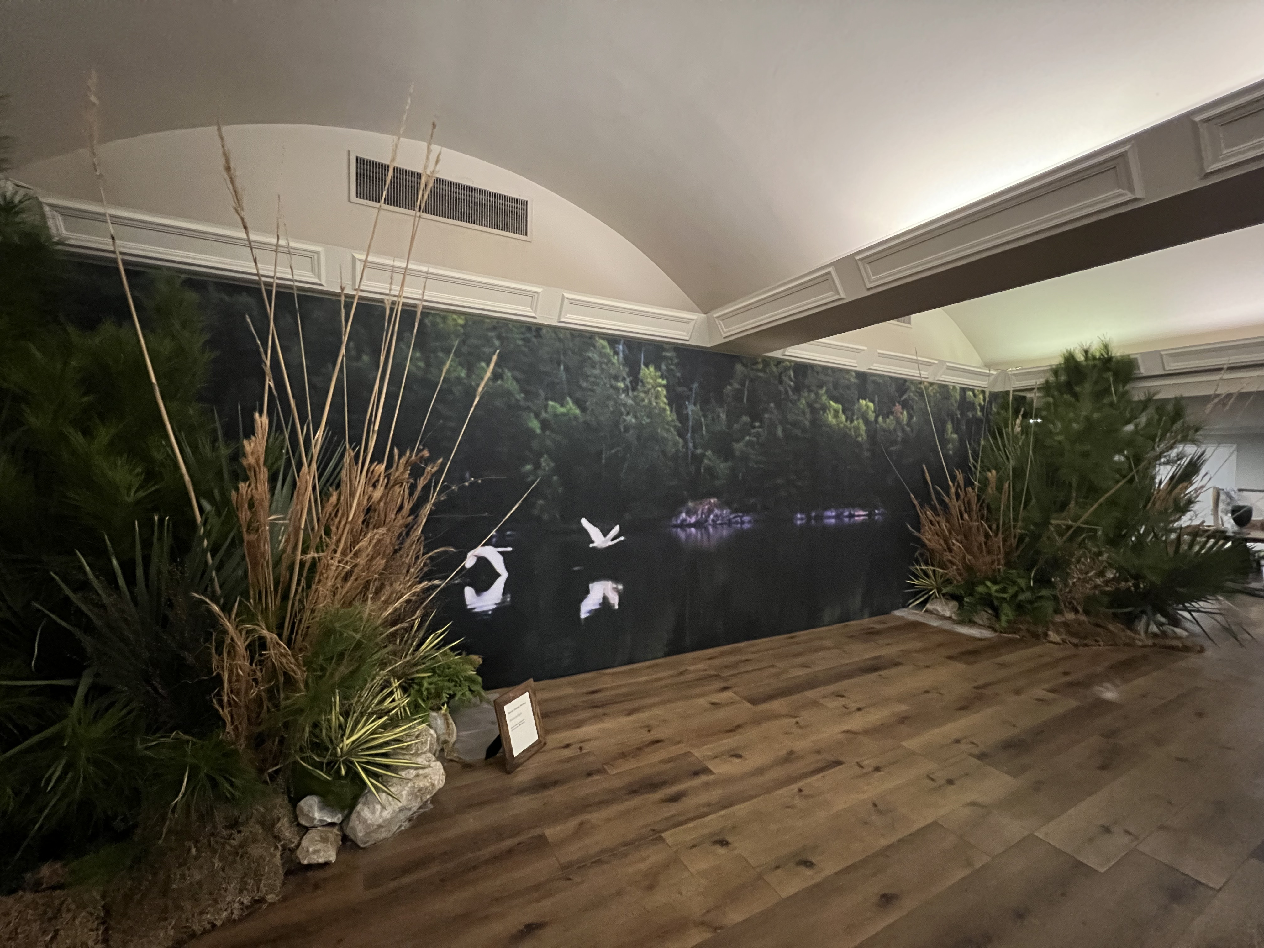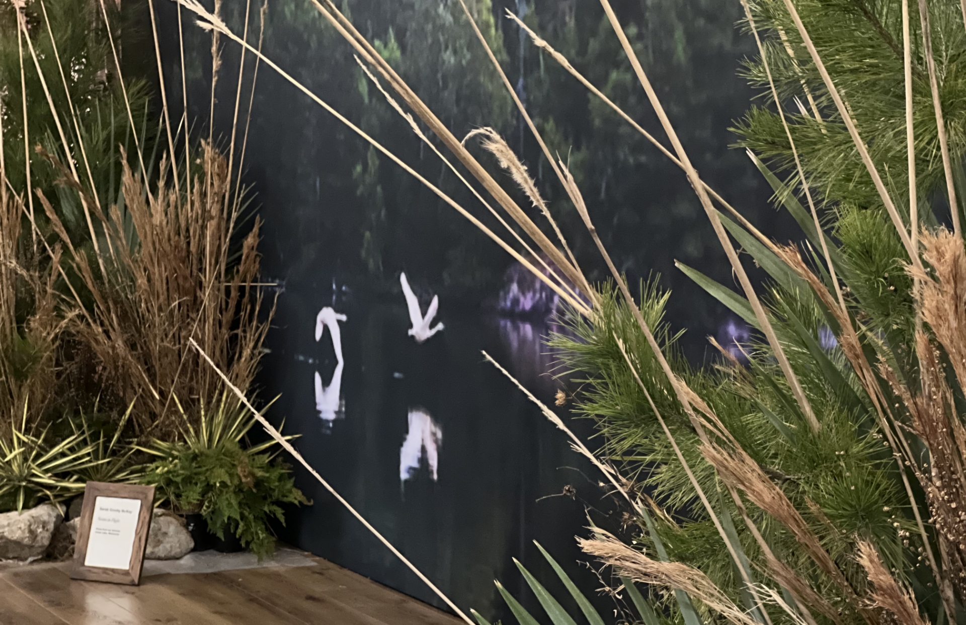 Rather than compete with the imagery, the landscape elements were designed to ground it. Moss, trees, sedges and other natural materials created a physical foreground that echoed the scale and restraint of the photographs. The installation framed the work without overwhelming it.