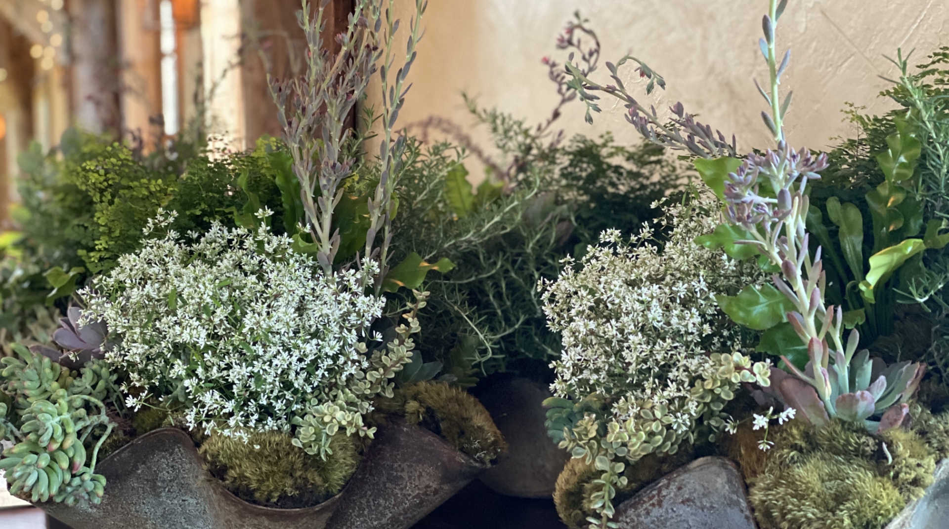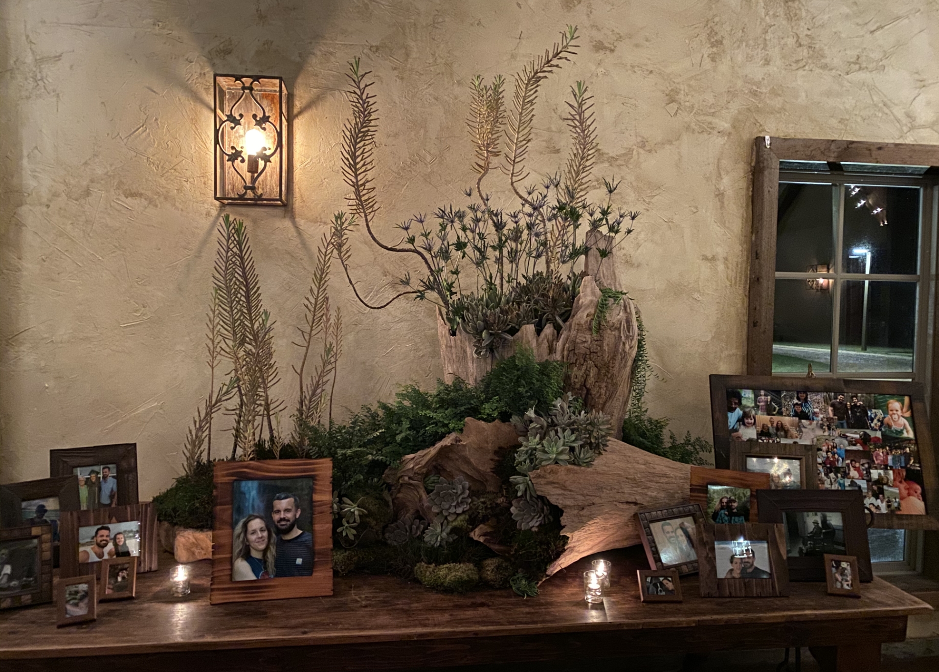 A photo table was anchored in moss and driftwood, layered with curated greenery that felt settled rather than staged. Scalloped copper planters introduced texture and depth without drawing attention to themselves.