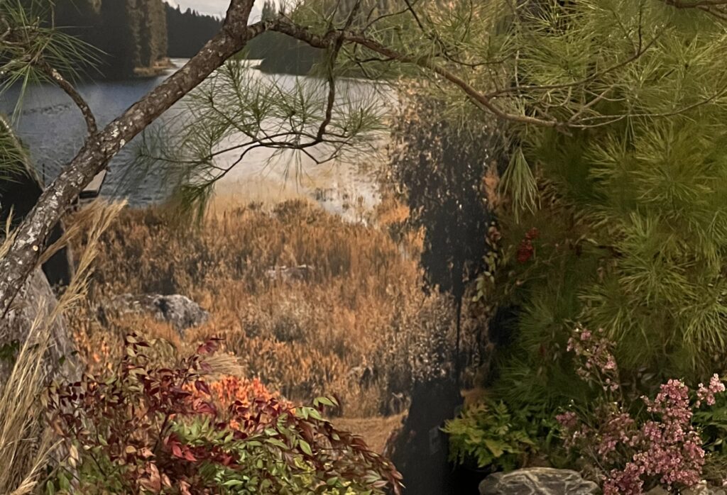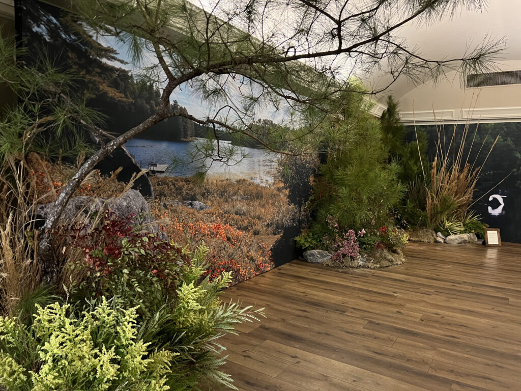 Rather than compete with the imagery, the landscape elements were designed to ground it. Moss, trees, sedges and other natural materials created a physical foreground that echoed the scale and restraint of the photographs. The installation framed the work without overwhelming it.