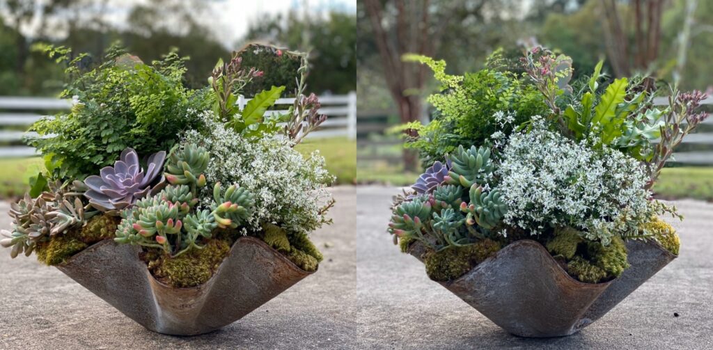 A photo table was anchored in moss and driftwood, layered with curated greenery that felt settled rather than staged. Scalloped copper planters introduced texture and depth without drawing attention to themselves.